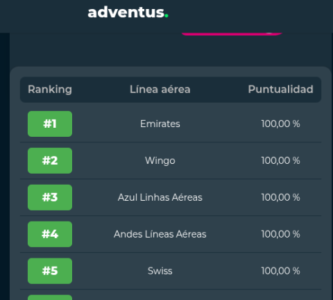 Según los datos recopiladospor la consultora Adventus®, cinco aerolíneas alcanzaron un índice de puntualidad del 100%, ubicándose en el tope del ranking. Estas son: Emirates, Wingo, Azul Linhas Aéreas, Andes Líneas Aéreas y Swiss. Este resultado refleja una operación sin contratiempos en sus vuelos con origen o destino a la principal terminal aérea de Argentina.