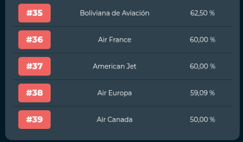 Sin embargo, el informe también revela que varias aerolíneas, en su mayoría de larga distancia, operaron con importantes niveles de demora. A la cabeza de esta lista menos favorable se encuentra Boliviana de Aviación, con un 62,50% de puntualidad. Le siguen Air France y American Jet, ambas con un 60,00% de vuelos puntuales. Completan esta sección Air Europa (59,09%) y Air Canada, que registró que solo la mitad de sus operaciones llegaron a tiempo (50,00%).
